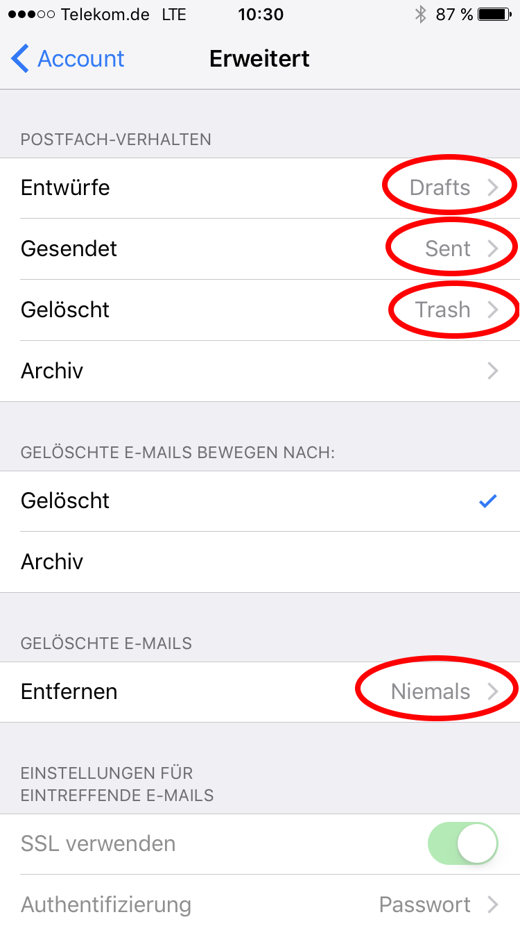 Nach dem Einspielen der Konfigurations-Datei muss leider im Mail Profil die Verzeichnise noch manuell zugeordnet werden. Bitte stellen Sie diese entsprechend der Bilddatei einmalig ein: